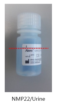 1) 용기 표시선까지 잘 맞추어(선을 넘지도 모자라지도 않게) Urine 7mL 을 받은 즉시 넣고