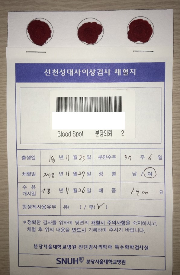 선천성 대사이상 질환을 신생아기에 스크리닝하여 조기 치료 및 예장할 수 있는 검사